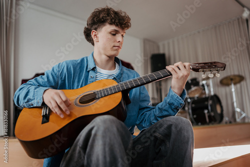 Teenage boy playing acoustic guitar in school music room.