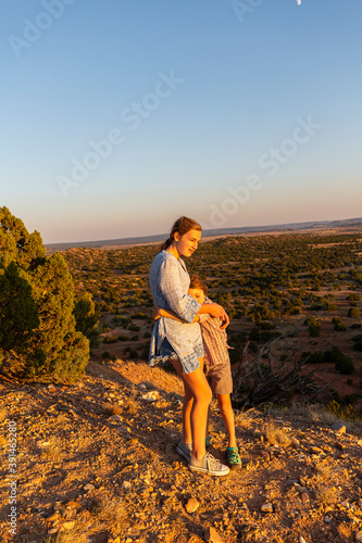 Teenage girl embracing her younger brother in the Galisteo Basin, Santa Fe