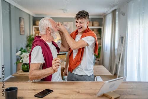 teenager and senior man grandfather use credit card shopping online