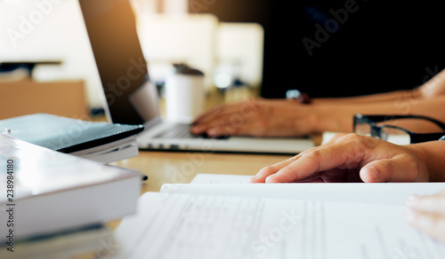 Teenager reading textbook in library.