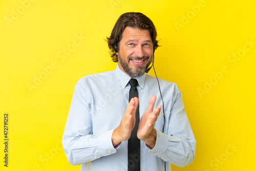 Telemarketer dutch man working with a headset isolated on yellow background applauding after presentation in a conference