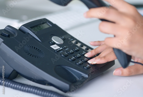 Telephone, call and closeup on receptionist hands for work conversation, communication or telemarketing. Hand, phone and office secretary calling, crm or administration to contact us on a landline