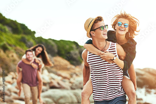 Tell me where you wanna go.... Cropped shot of two affectionate young couples enjoying their time on the beach.