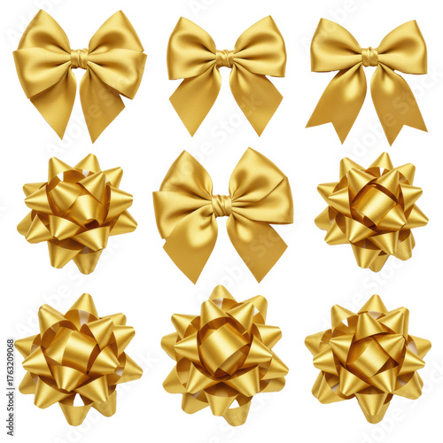 Ten individual, opulent gold satin bows in various elegant styles, glossy and high-sheen, meticulously crafted, isolated on a transparent background with copy space. Luxurious festive gifting