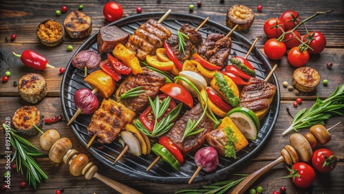 Tender Asian BBQ grilled meat and vegetables , Asian, BBQ, grilled, meat, vegetables, cooking, outdoor, delicious, juicy, savory