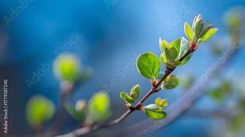 Tender new green leaf buds emerge from a woody branch against a vibrant blue background