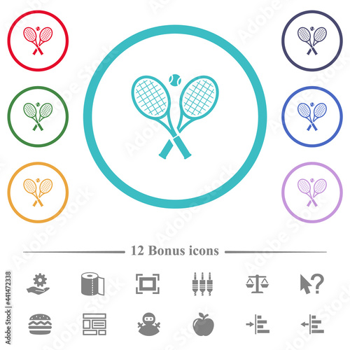 Tennis rackets with ball flat color icons in circle shape outlines
