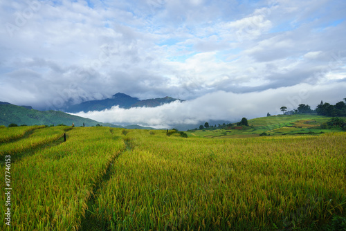 Terraced rice field landscape in harvesting season with low clouds in Y Ty, Bat Xat district, Lao Cai, north Vietnam