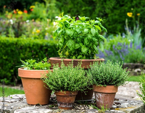 Terracotta herb pots in garden