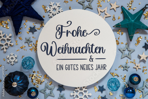 Text Frohe Weihnachten,Means Merry Christmas, Blue Christmas Decoration, Flatlay