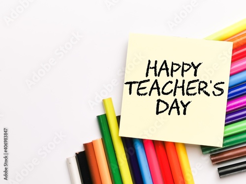 Text HAPPY TEACHER'S DAY on paper note with colorful pencils isolated on white background.