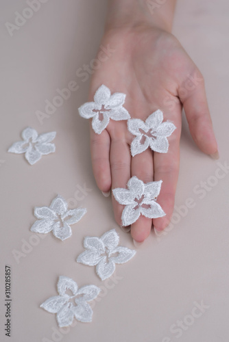 Texture lace fabric. lace on white background studio. thin fabric made of yarn or thread. a background image of ivory-colored lace cloth. White lace on beige background.