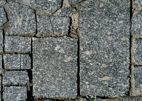 Texture of gray granite paving stones, top view. Background from natural block stone.
