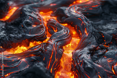 Textured surface of molten lava, featuring glowing orange hues and flowing streams. Molten lava textures offer a dramatic and intense backdrop