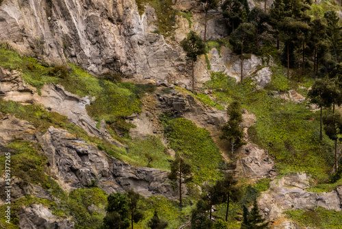 Textures of rocks, grass and trees in toy landscape. Landscape for toy railroads