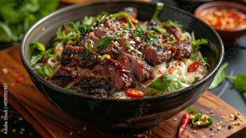 Thai beef noodle bowl being prepared, showcasing the ingredients being cooked