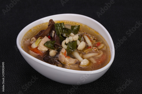 Thai style soup with meat and mushrooms