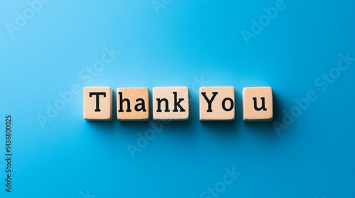 "Thank You" spelled with wooden blocks on a blue background. A clear and simple expression of gratitude with copy space.