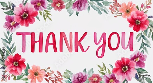 Thank you word lettering with watercolor painting flowers on plain white background