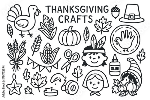 Thanksgiving Craft Icons. Thanksgiving crafts doodle set: hand drawn icons for kids’ art projects and autumn decorations, isolated