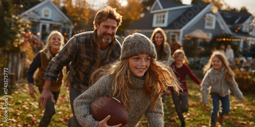Thanksgiving Football. Family playing a friendly game of football in the yard on Thanksgiving Day. Celebration, tradition, fun.
