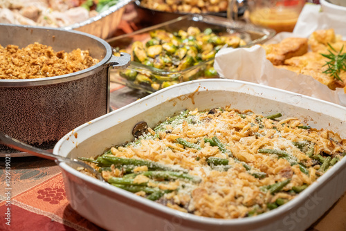 Thanksgiving Holiday Fixings laid out ready for the feast. Homemade comfort food concept.