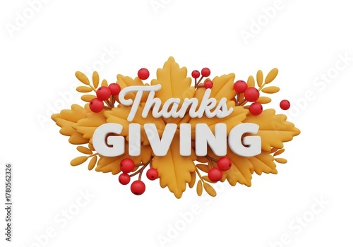 Thanksgiving text with autumn leaves and berries, 3D render