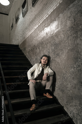The artist sits on the stairs
