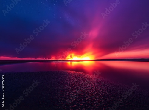 The Aurora Borealis Displays a Vibrant Arc of Green and Purple Light Across a Starry Night Sky, Reflecting in the Calm Waters of a Lake or Ocean, with Snow-Covered Land in the Foreground and Backgroun