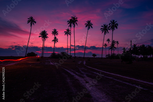 The background of the morning sunrise on the lake, the beautiful twilight sky changes over time, the blurring of the wind blowing through the trees and the beautiful seaside trees.