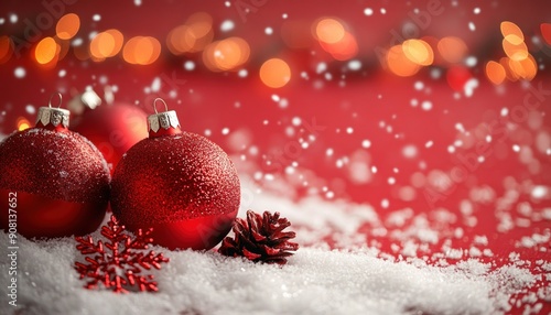 The beautiful Christmas decorations sit elegantly in soft snow on a bright red background
