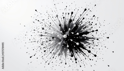 The black and white splatch explosion showcases the dynamic dispersion of particles as they spread out in a chaotic yet organized manner