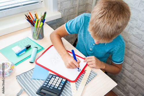 The boy writes on the blackboard with a marker. Office supplies are laid out on the table. Back to school.