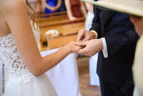 the bride and groom during the wedding ceremony put wedding rings on their fingers
