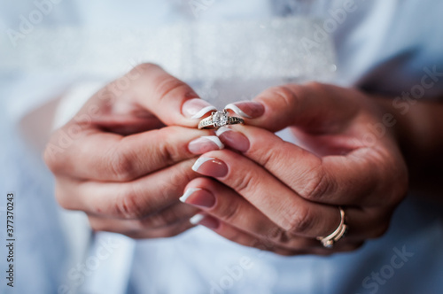 the bride holds a gold ring in her hands