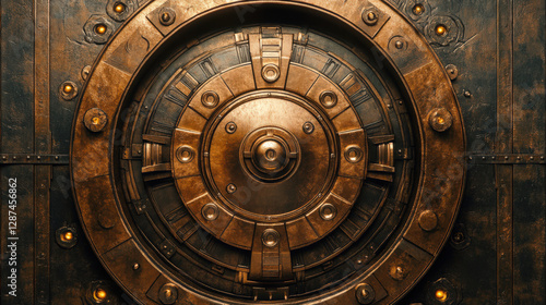 The bronze door of the old bunker. The concept of the shelter's entrance door. Reliable metal safe. Information protection. Cybersecurity. The locked bank door to the money vault. Gold
