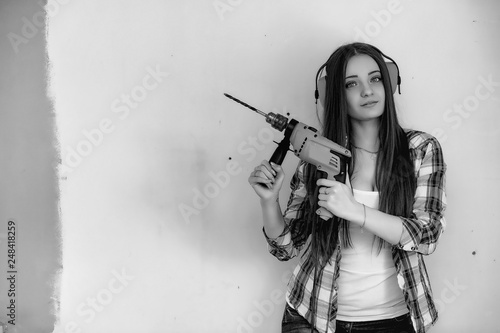 The builder makes repairs in the apartment. Finishing works on plastering and painting of walls. Masters work with paint drill and electricity.