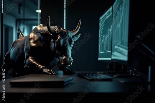 the bull sits at the computer and watches the stock exchange. Created with Generative AI Technology