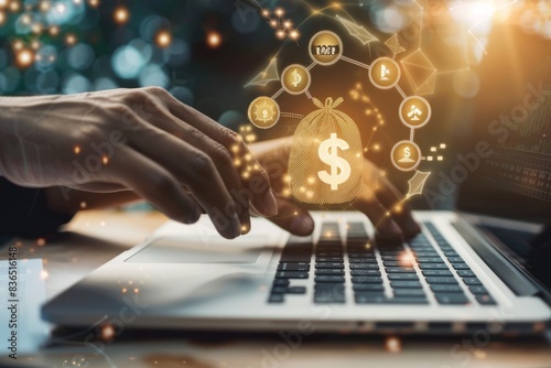 The businessman's hand uses a laptop, pointing to a virtual screen of money bag ICONS, charts or financial development charts, budgets and financial planning concepts.