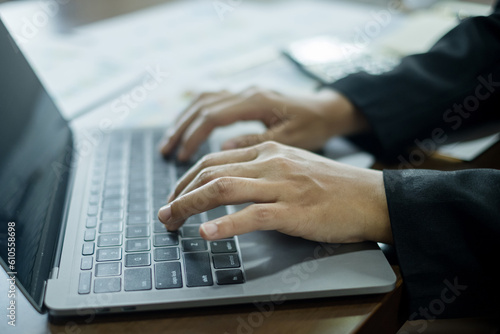 The businesswoman hand sits at their desks and calculates financial graphs showing the results of their investments planning the process of successful business growth