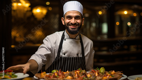 The chef in the restaurant is serving food