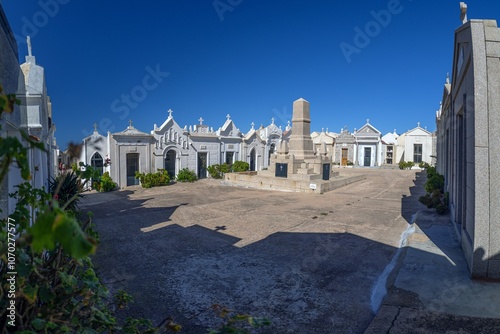 The Cimiteriu Marinu di Bunifaziu near Bonifacio, Corsica, with ornate white tombs and a central monument under a clear sky