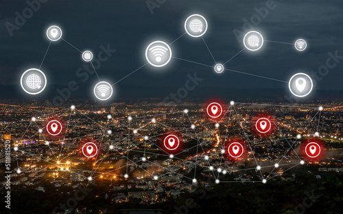 The city or landscape view with the technology icons of 5G phone wifi or internet.