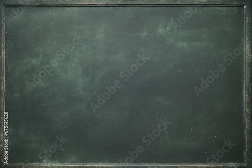 The close up detail and texture of a blank chalkboard horizontal wallpaper and background. Image of green board for writing and drawing with chalks. Generative AI.