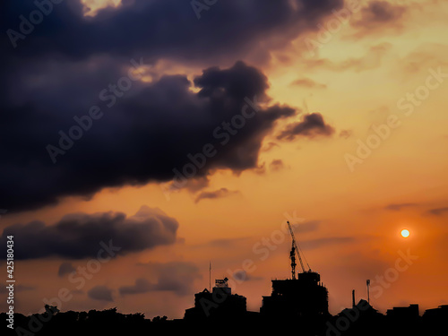 The construction site has a tall crane Behind the Sunset background