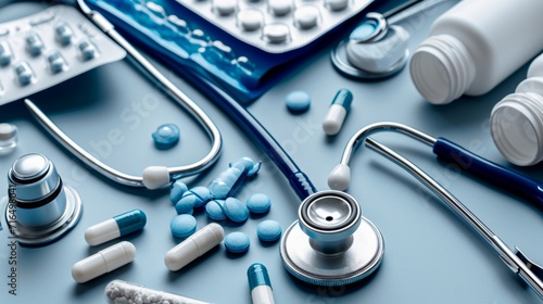 The critical role of medical supplies. Drugs, the cure, supplements, medicine tools, pharmacy, etc.
