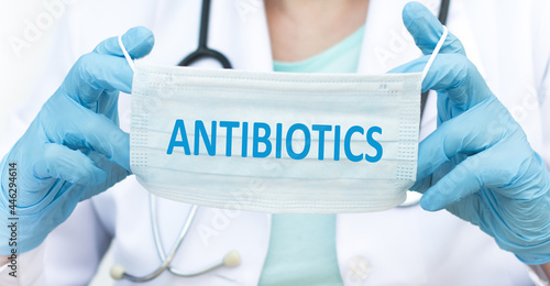 the doctor holds a blue disposable mask with text ANTIBIOTICS in his hands. Medical concept.