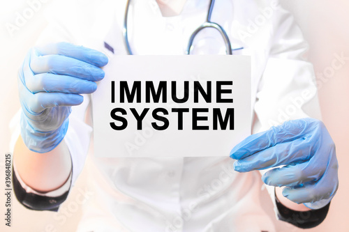 The doctor's blue - gloved hands show the word IMMUNE SYSTEM - . a gloved hand on a white background. Medical concept. the medicine