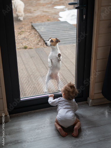 The dog stands at the patio window and asks to go inside the house to the baby boy on the other side of the door. Vertical photo.