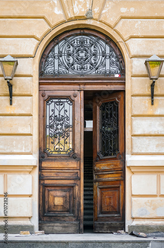 The door of the old European building. Exterior design element of ancient Lvov. Example of world architectural heritage.